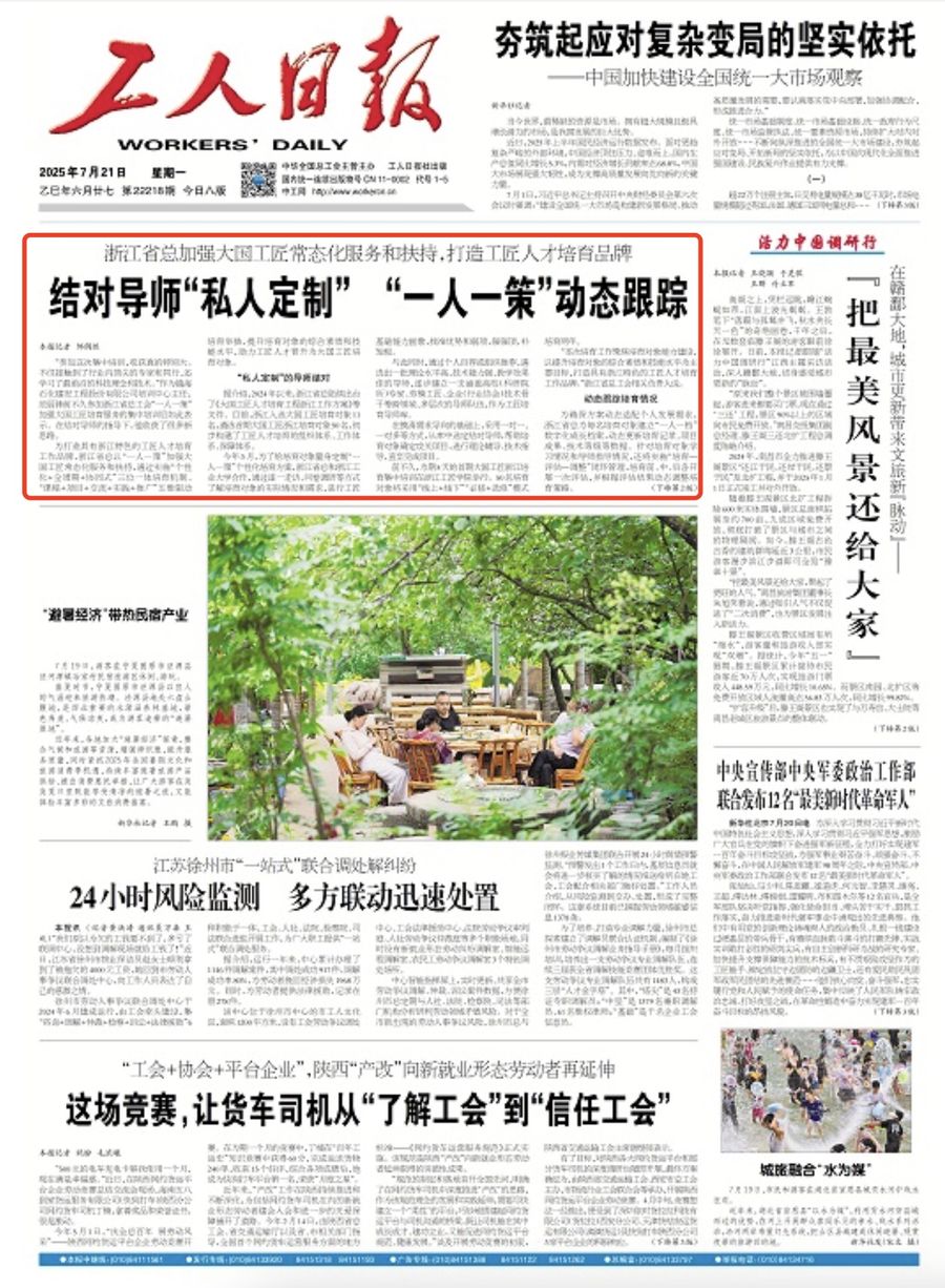 7月21日,《工人日报》头版以《结对导师“私人定制” “一人一策”动态跟踪》为题,报道浙江省总工会和437437必赢国际网址合作打造具有浙江特色的工匠人才培育工作品牌。培育工作通过逐一走访、问卷调研等方式了解培育对象的实际情况和需求,进行工匠基础能力画像,找准优势和弱项,强强项,补短板,进一步提升培育对象的综合素质和技能水平,助力工匠人才晋升为大国工匠培育对象。
